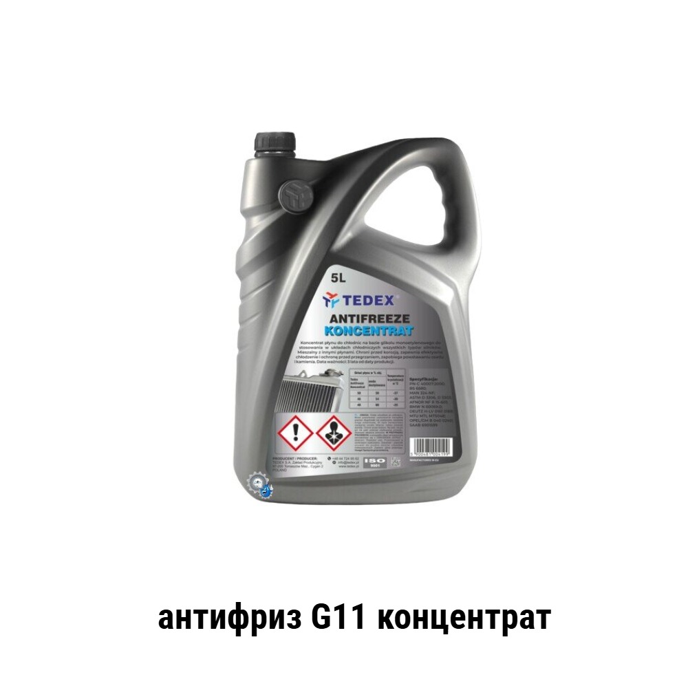 Antifreeze Koncentrat G11 -80 Tedex -концентрат всесезонної охолоджувальної рідини для автомобільних систем охолодження, що містять елементи зі сталевих, чавунних, алюмінієвих, мідних та інші кольорових металів, а також пластикові та гумові деталі. Koncentrat Antifreeze Tedex виготовлений на основі етиленгліколю з додаванням пакету поліпшувальних присадок: антикорозійних, антиокислювальних, протипінних і стабілізувальних, які надійно захищають компоненти двигуна від корозії та кавітації. Спеціальний пакет інгібіторів корозії G11 використовує неорганічні компоненти.