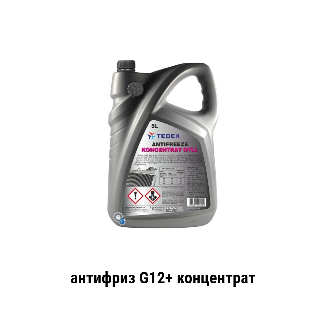 Antifreeze Koncentrat OT LL -80 Tedex -концентрат всесезонної охолоджувальної рідини для автомобільних систем охолодження, що містять елементи зі сталевих, чавунних, алюмінієвих, мідних та інші кольорових металів, а також пластикові та гумові деталі. Koncentrat Antifreeze Tedex G12/12+ виготовлений на основі екологічно чистої технології органічних кислот і не містить силікатів, нітратів, нітритів і боратів, він має антиоксидантні, лугостабілізуючі та антипінні властивості, які надійно захищають компоненти двигуна від корозії та кавітації. Спеціальний пакет інгібіторів корозії G12/12+ використовує органічні компоненти.